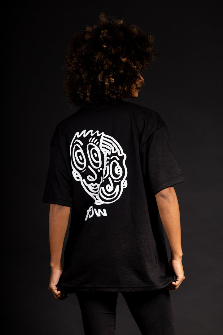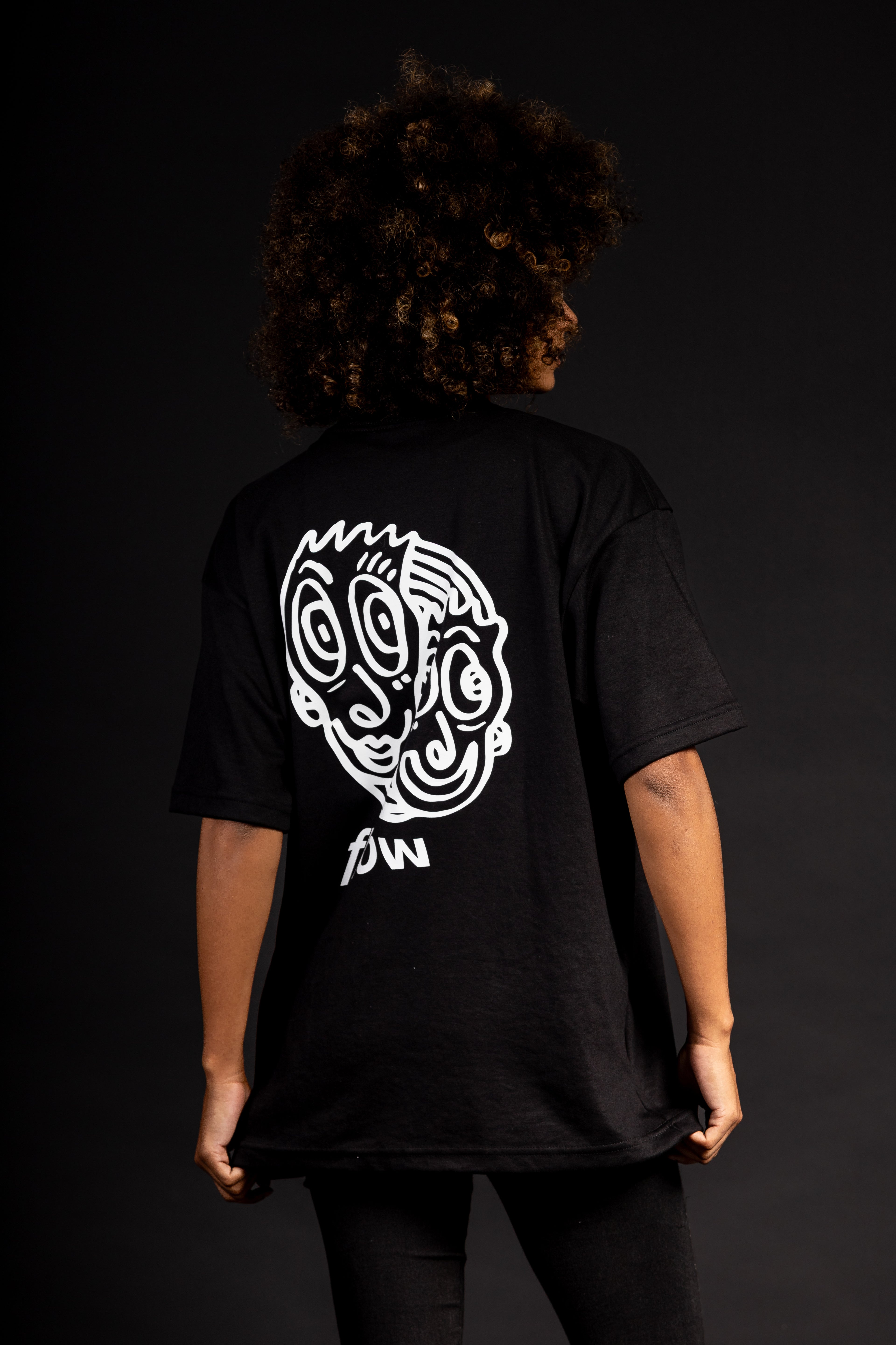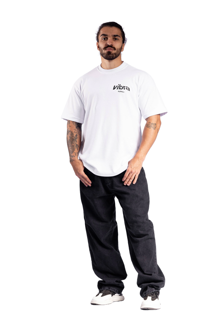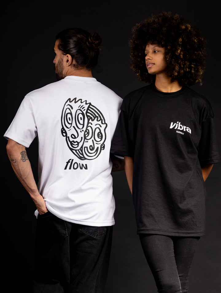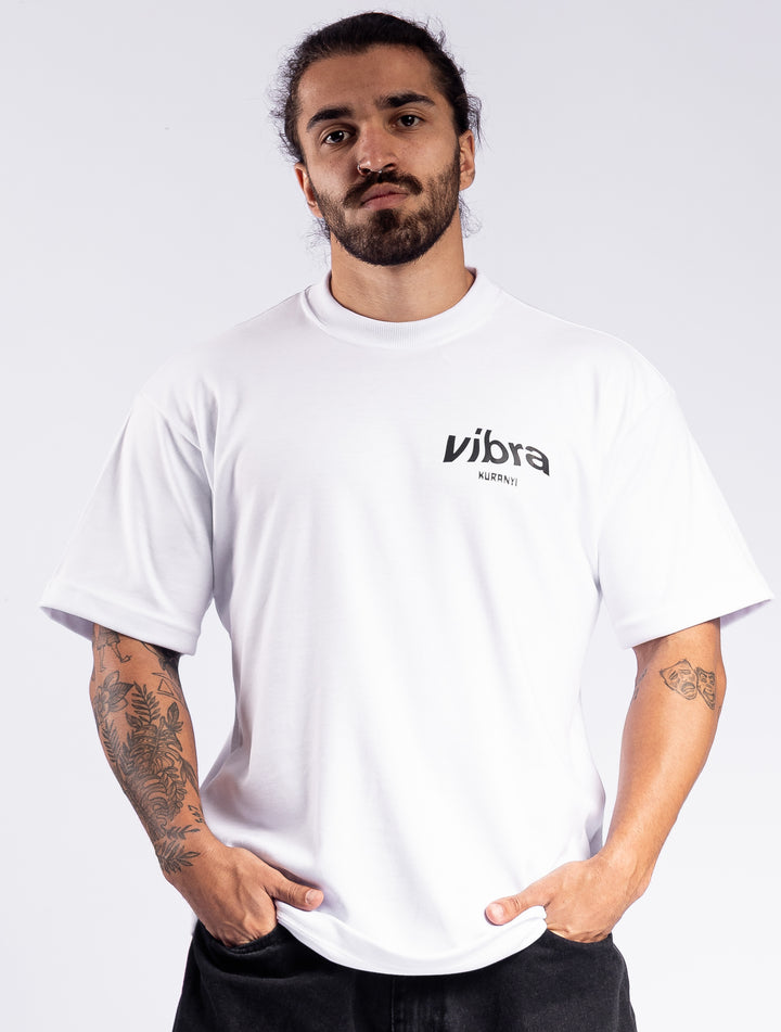 Premium white cotton T-shirt with back print featuring Romulo Kuranyi’s new Vibra Faces.
